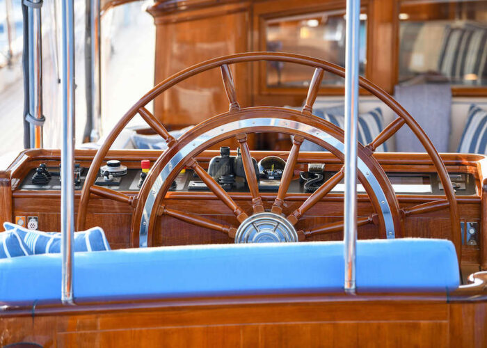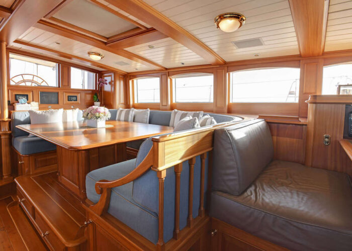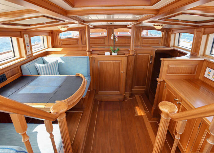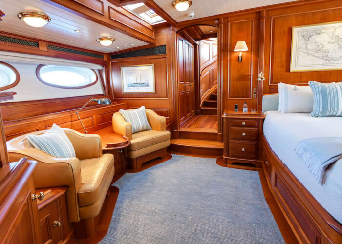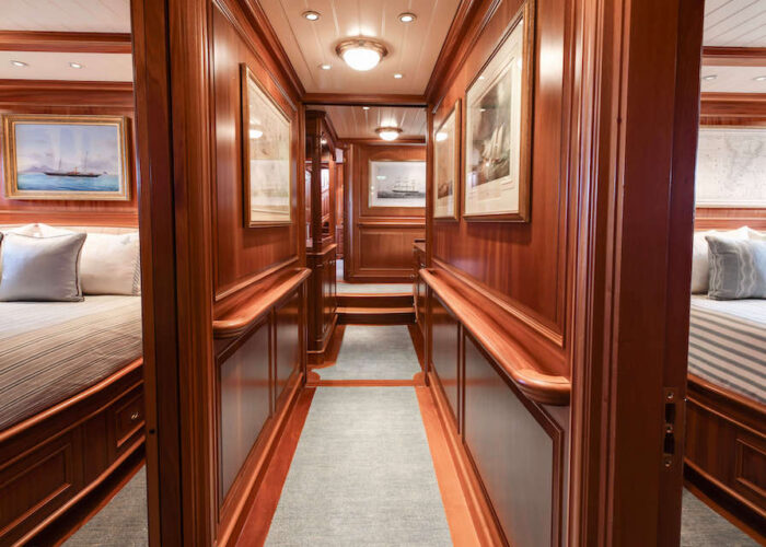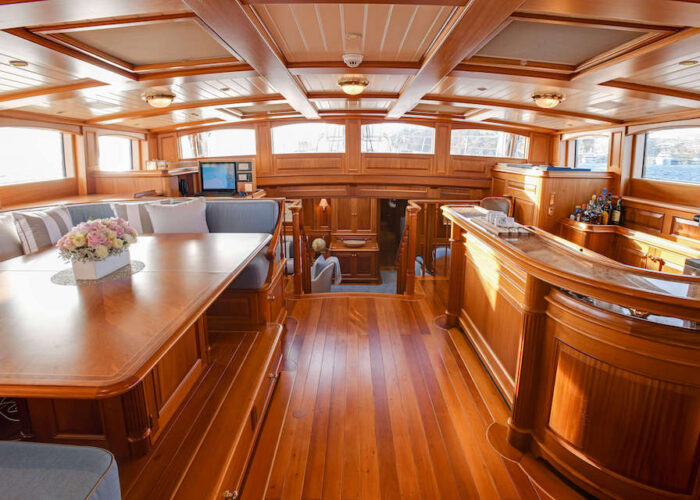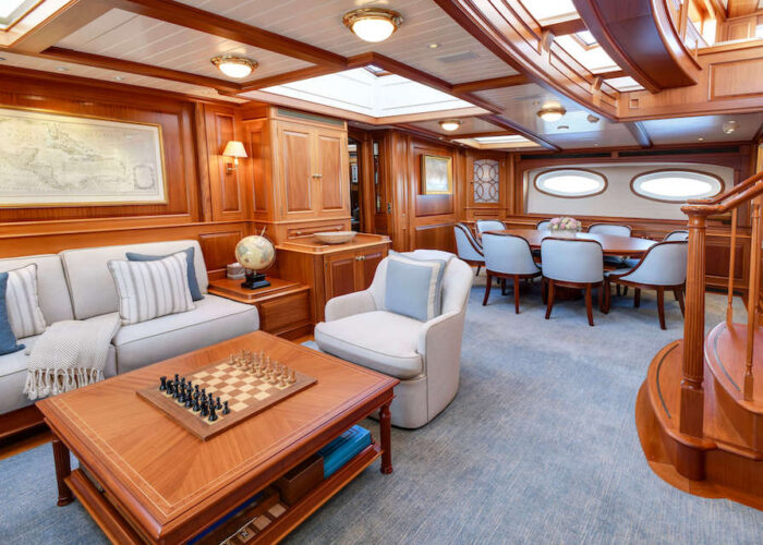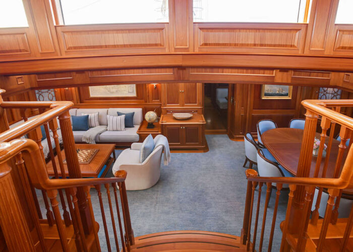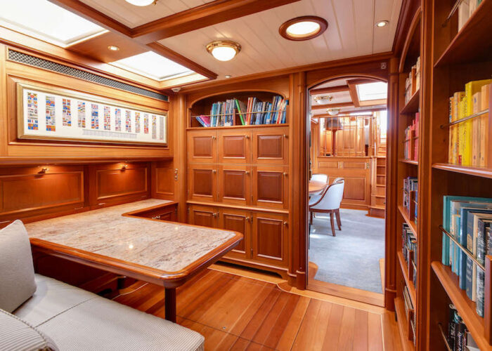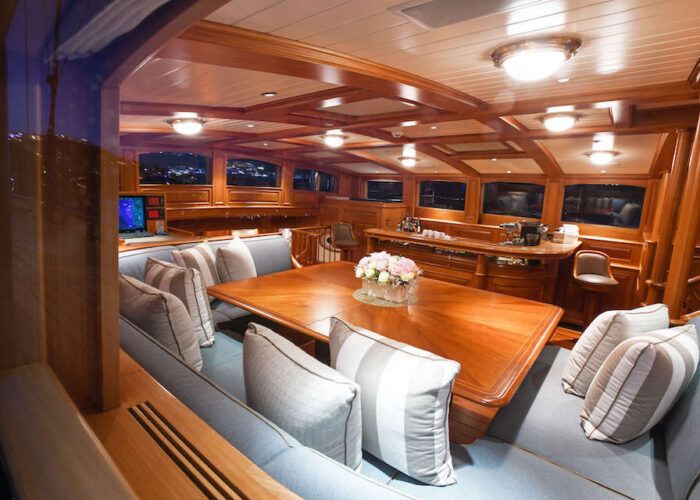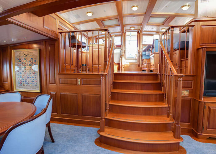 Internally, s/y ANNE offers a luxurious retreat with an interior styled by Redman Whitely Dixon of the UK. The Cuban Mahogany woodwork by De Ruyter Quality Interiors in the Netherlands adorns the living spaces, including a large owner’s cabin aft with a private deckhouse.