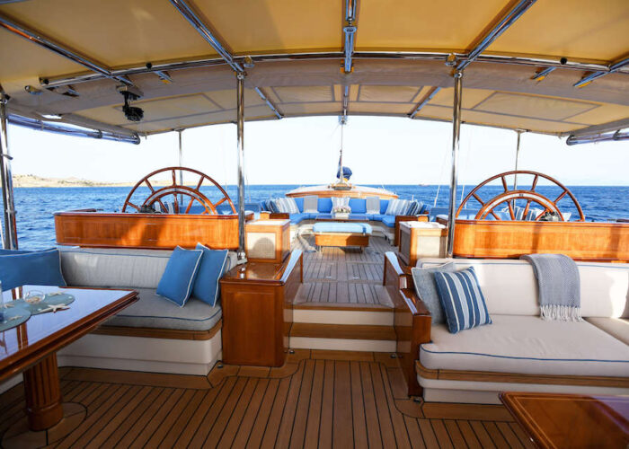 including a main guest cockpit midships and twin steering consoles, all covered by a Bimini. Adjacent a seating area on deck just aft of the main cockpit. On the foredeck there is a dedicated crew cockpit with integrated access to the crew areas.