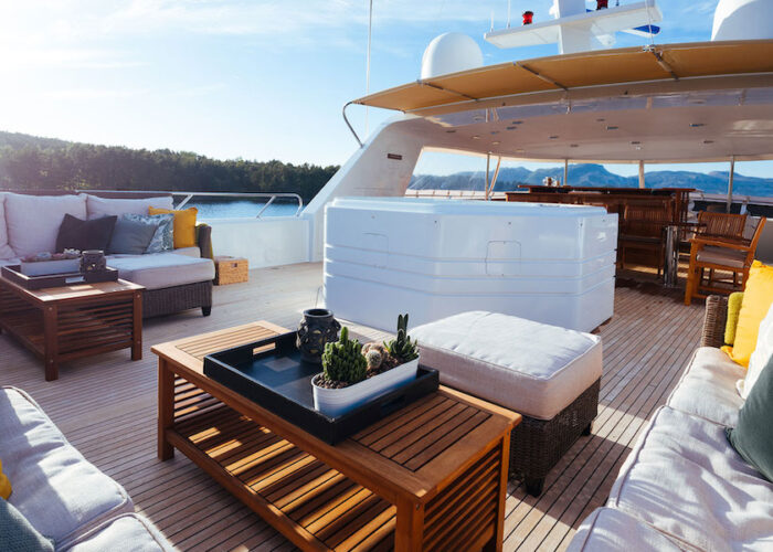 On top is a sundeck, with bar, Jacuzzi and full size dining table. The forward half of sundeck is shaded