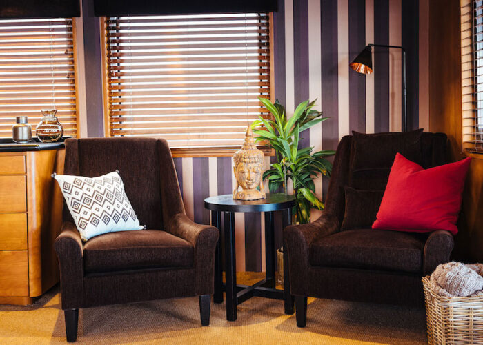 an intimate place for relaxing or working, with twin suitably sized dining tables on the deck outside.