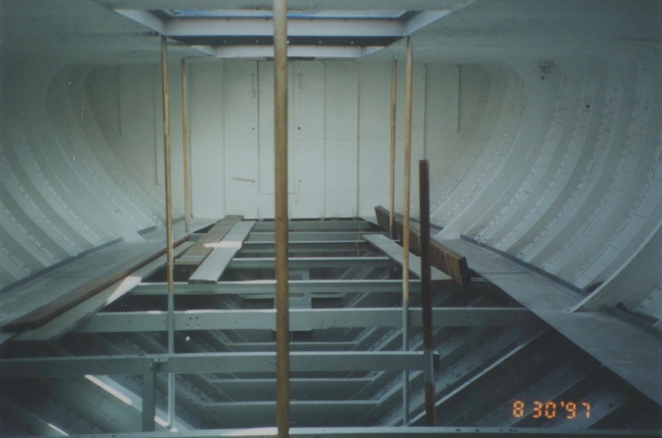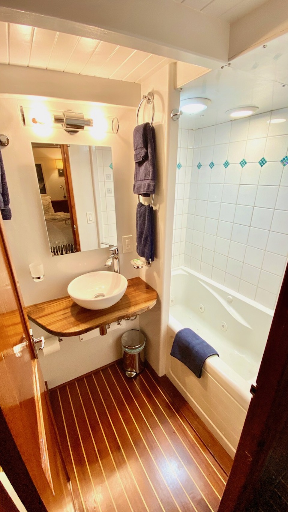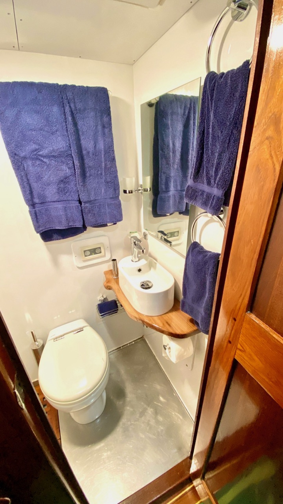 The crew quarters are separate, forward of the galley, and have six bunks and two more heads and showers.