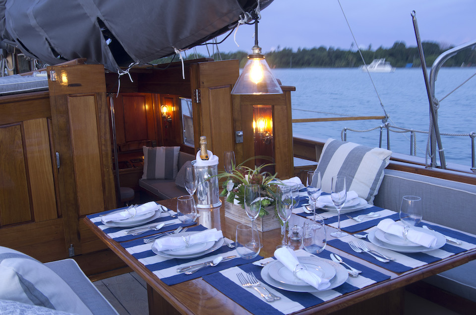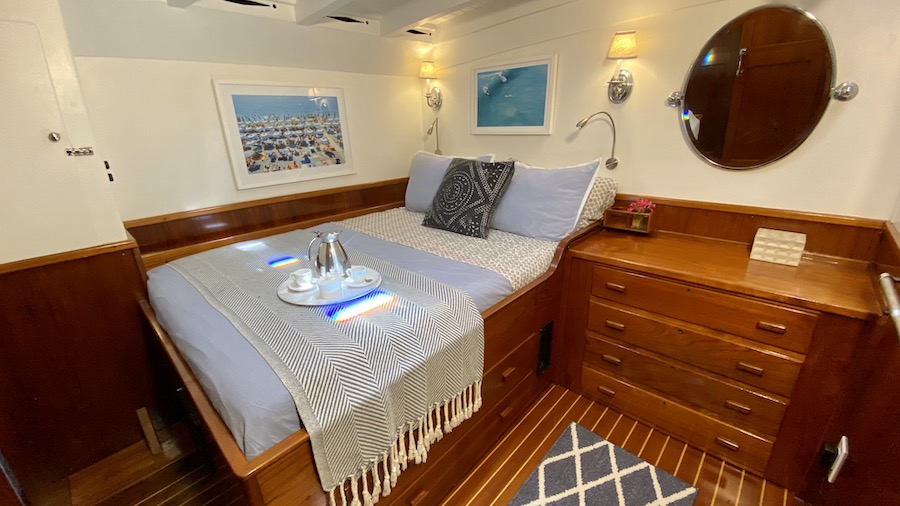 There are four 2 person cabins in total, plus the convertible berths in the saloon and deck house. She will comfortably accommodate 8 ideally but up to twelve guests if needed.