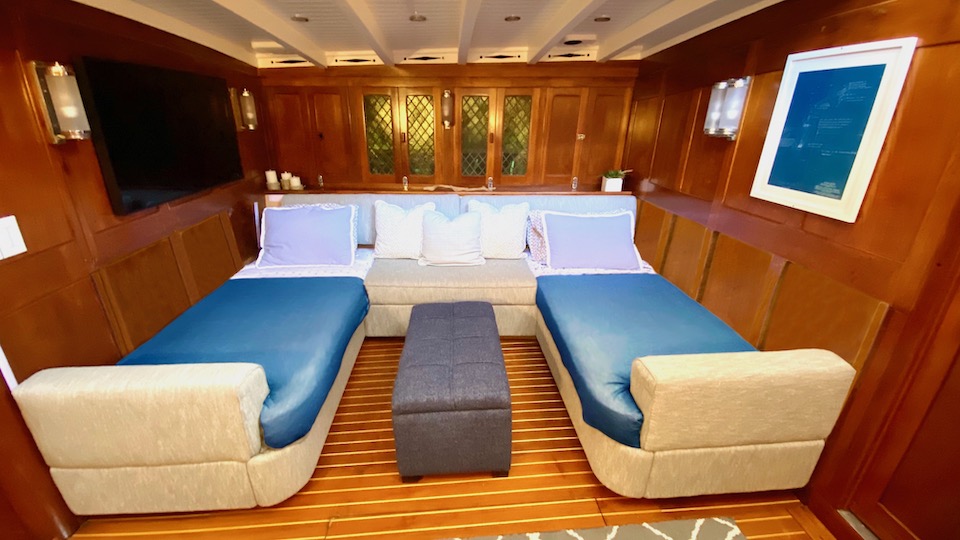 The deck house features two long couches for lounging, happy hour, etc., and are also very comfortable beds if needed.