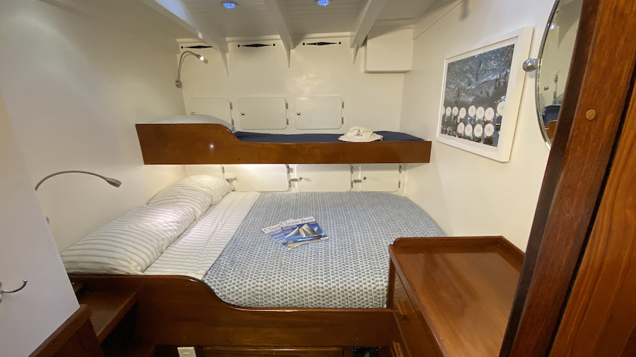 Two smaller twin cabins with over and under bunk beds. These two cabins share a head and shower.